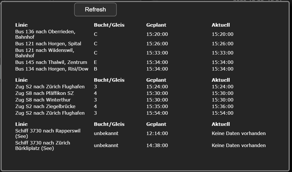 Dank der Open Data Projekten wie Open-Data-Plattform Mobilität Schweiz stehen viel Daten als Service zu Verfügung, ein Service der SBB. In Deutschland sei hier Willkommen – OpenData ÖPNV (opendata-oepnv.de) erwähnt, leider ist in Deutschland durch den ÖPNV Flickenteppich keine Möglichkeit die Daten beim einem Zentralen Service abzufangen.